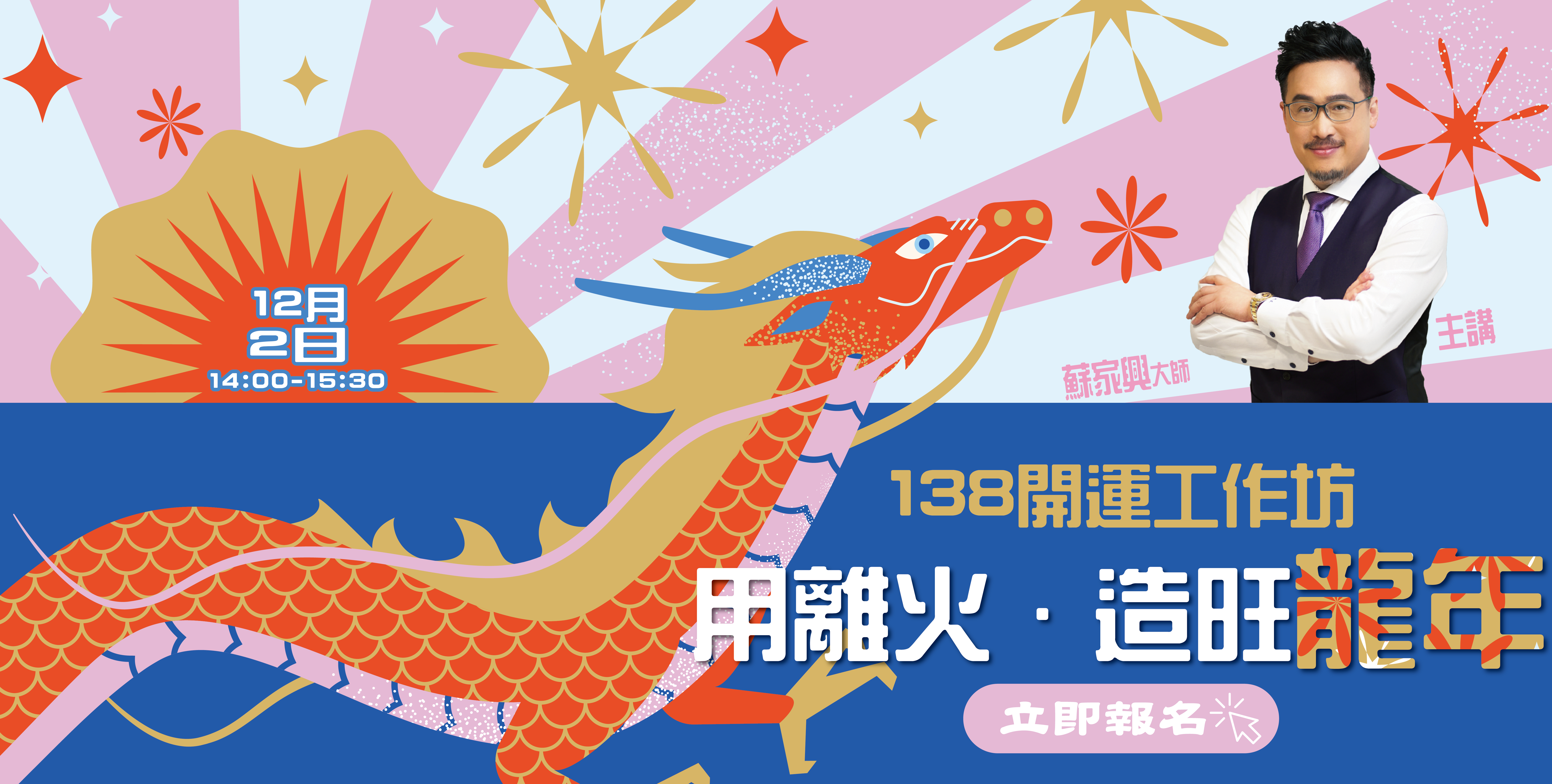 在12月2日下午2時舉行的【138開運工作坊:用離火.造旺龍年】,蘇家興大師將會為大家解開各種九運開局的疑團,提供前瞻性的分析,助您在來年擬定良好的發展計劃,把握九運「轉勢」的大好機會。