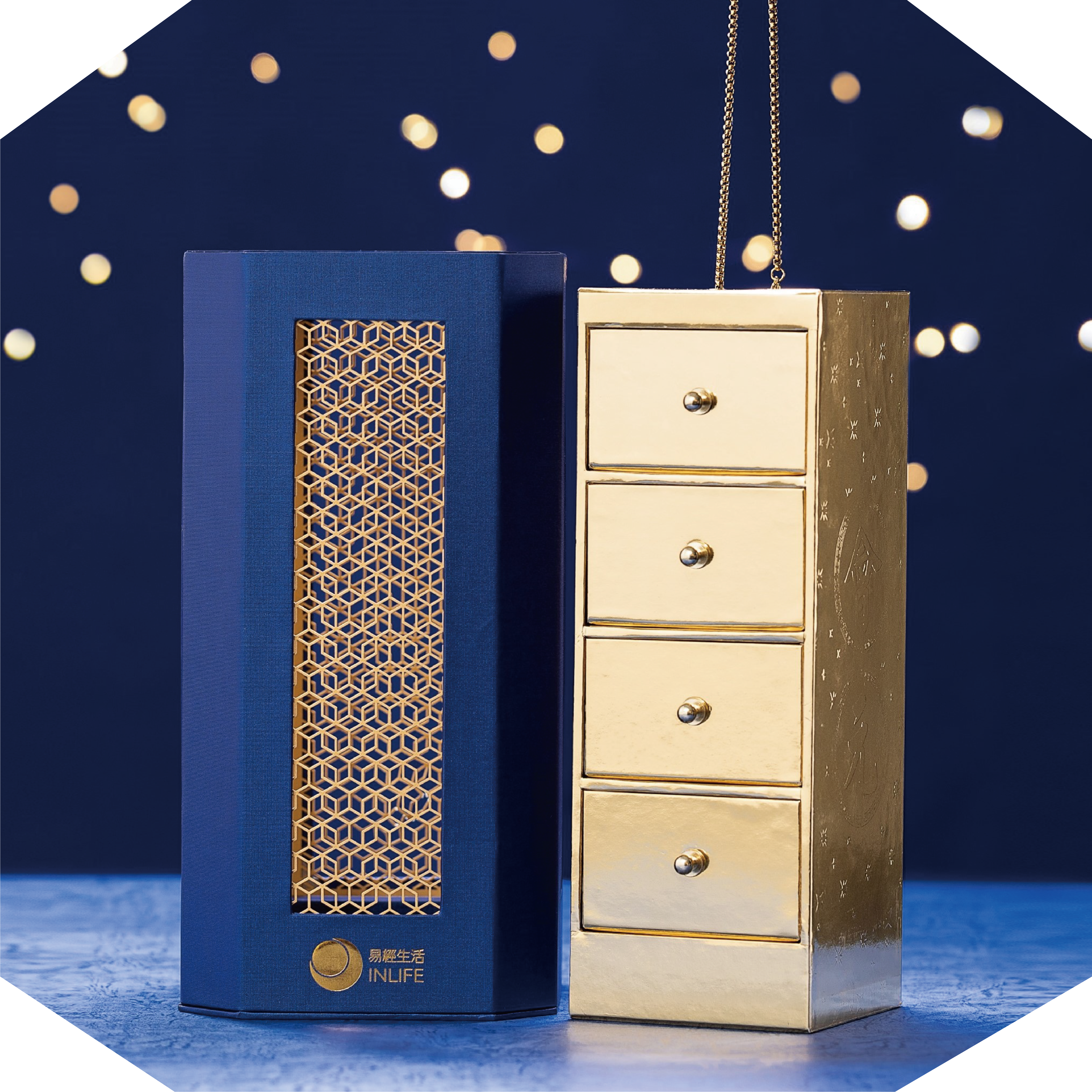 精心設計的【旺財‧珍寶燈】除了特意採用直立式「金」字三角形外觀之外,更刻意在中空間隔設置特色圖案之亮燈照明,營造出九運最強「離火」卦象之效果。